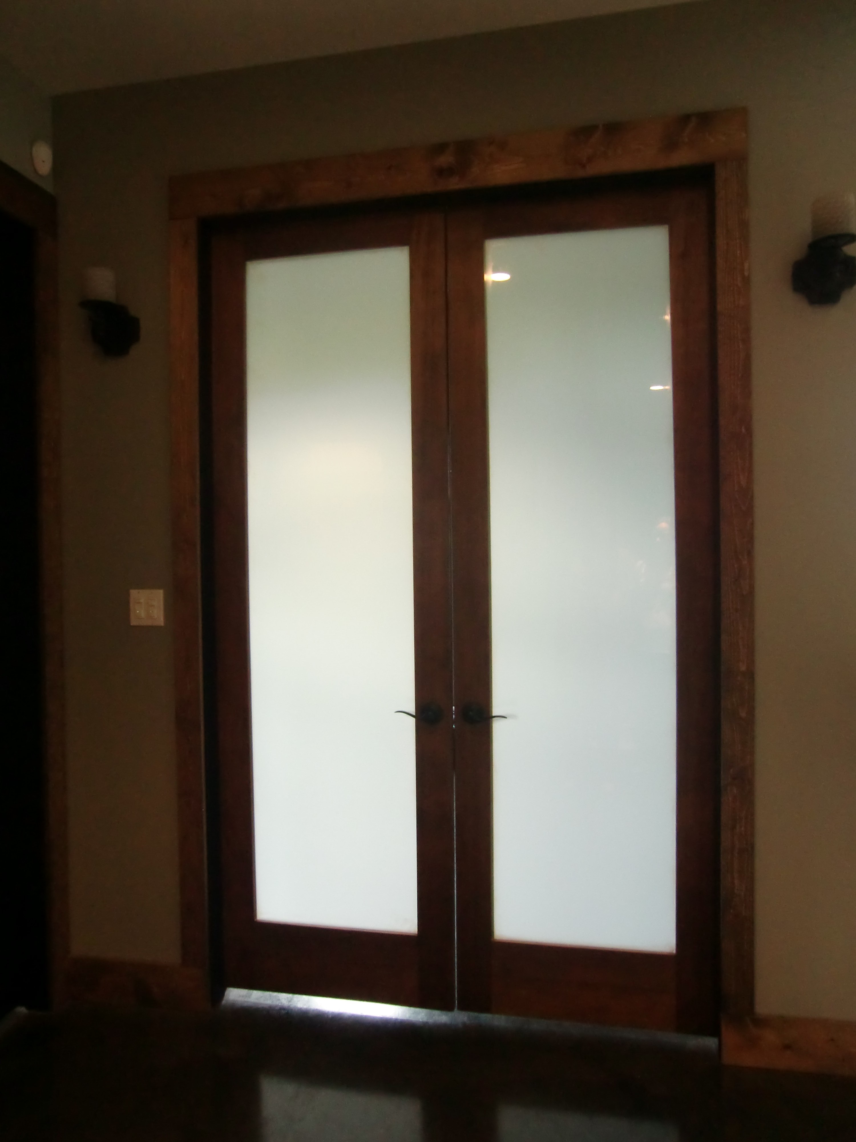 The default for interior doors is clear glass and exterior doors is low-E argon clear glass. Options include white lami, rain, granite and virtually any other type of art glass, and any combination of true divided lite bars..