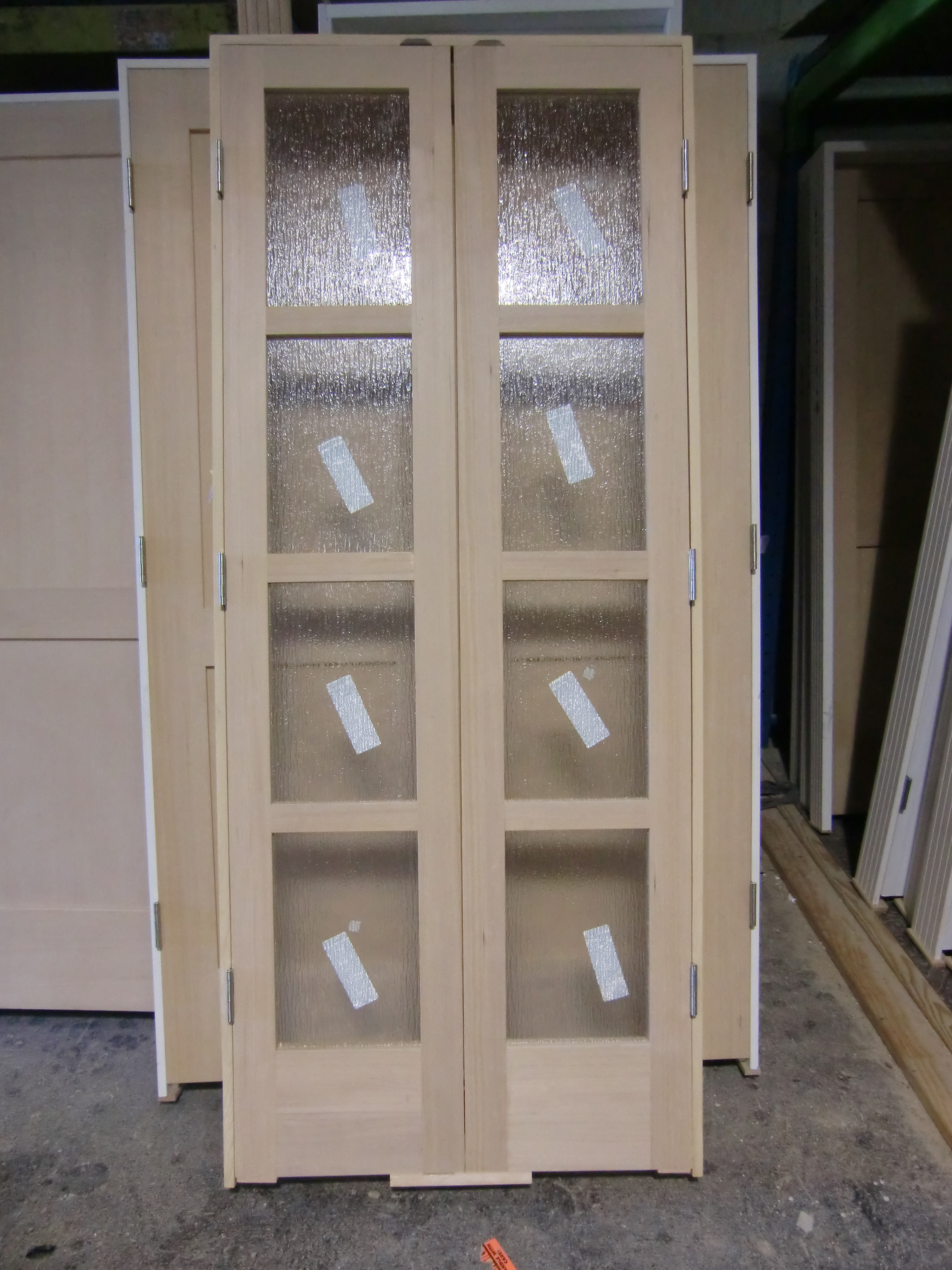 The default for interior doors is clear glass and exterior doors is low-E argon clear glass. Options include white lami, rain, granite and virtually any other type of art glass, and any combination of true divided lite bars..